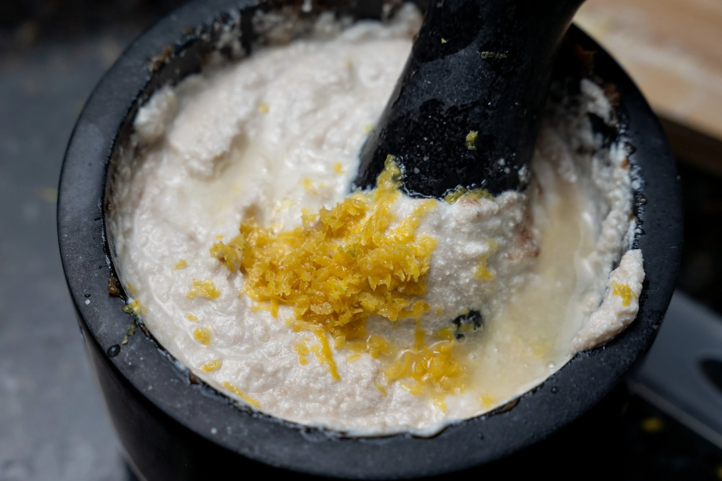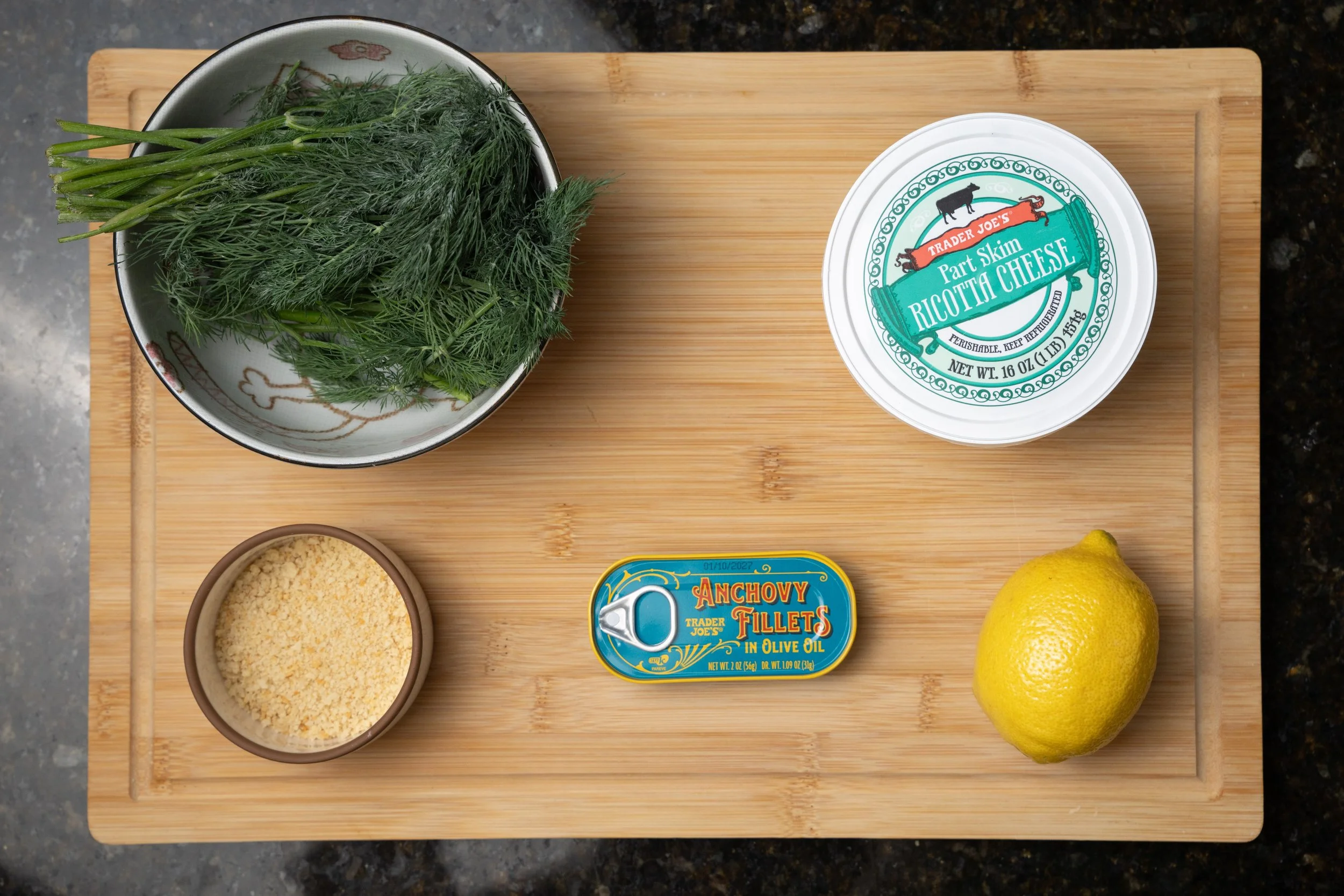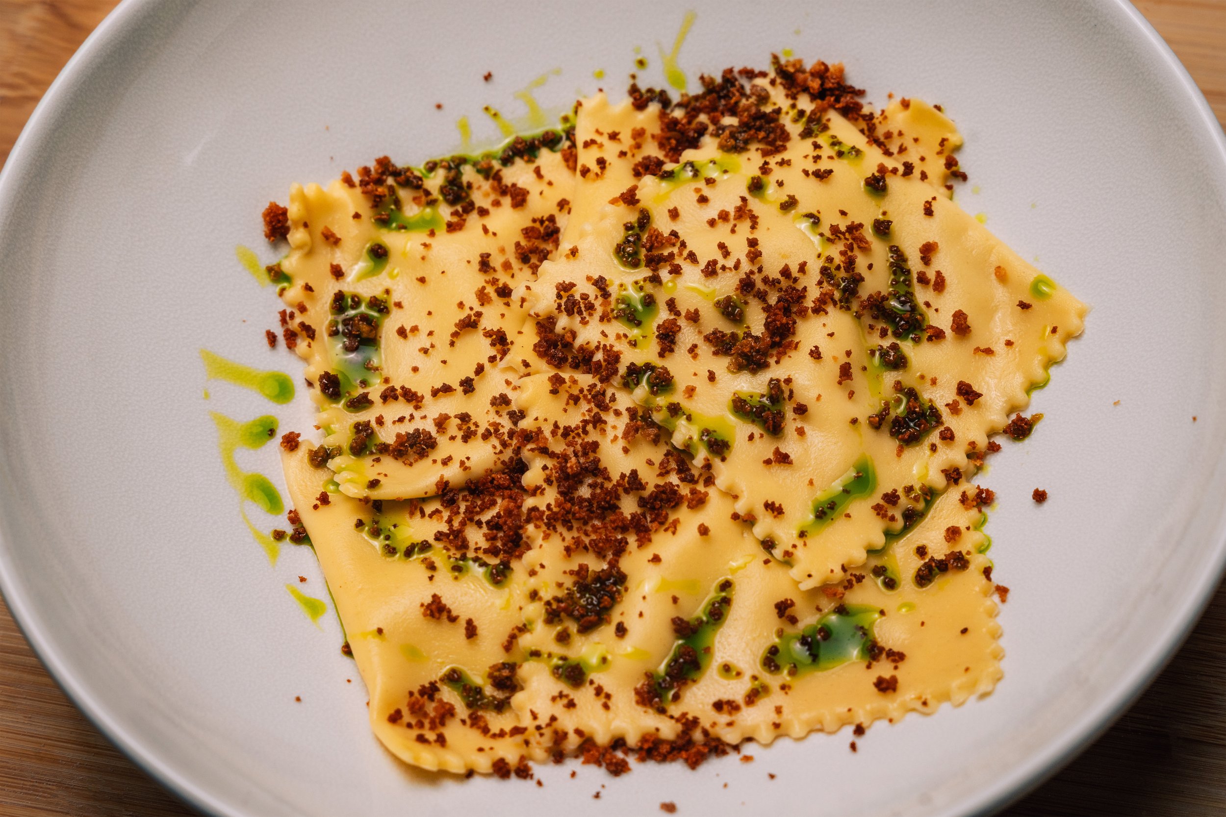 Homemade ravioli filled with a lemon-anchovy ricotta cream, finished with dill oil and toasted breadcrumbs.