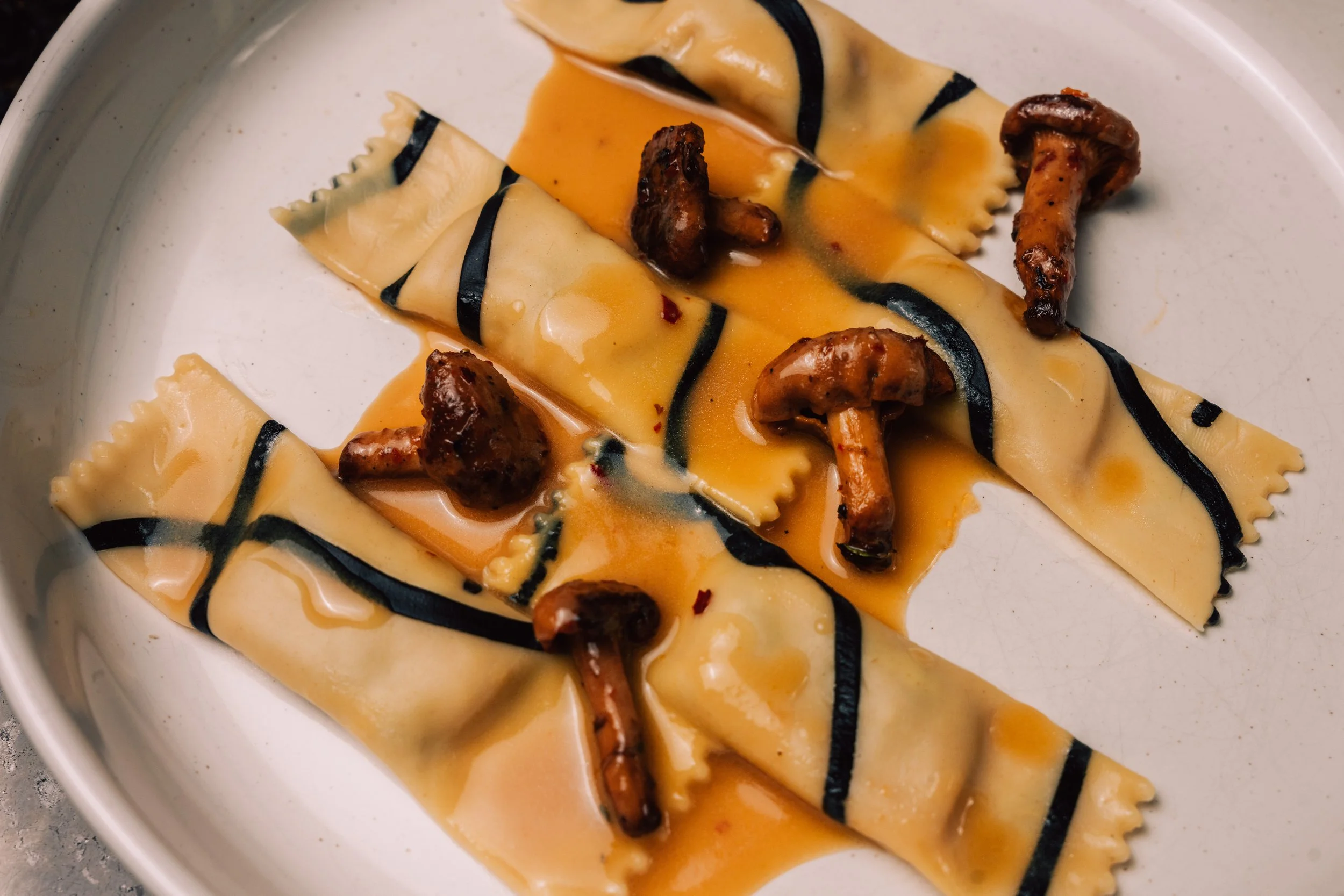 Handmade striped caramelle filled with roasted squash and chanterelles, served with a miso beurre blanc and sautéed chanterelles.