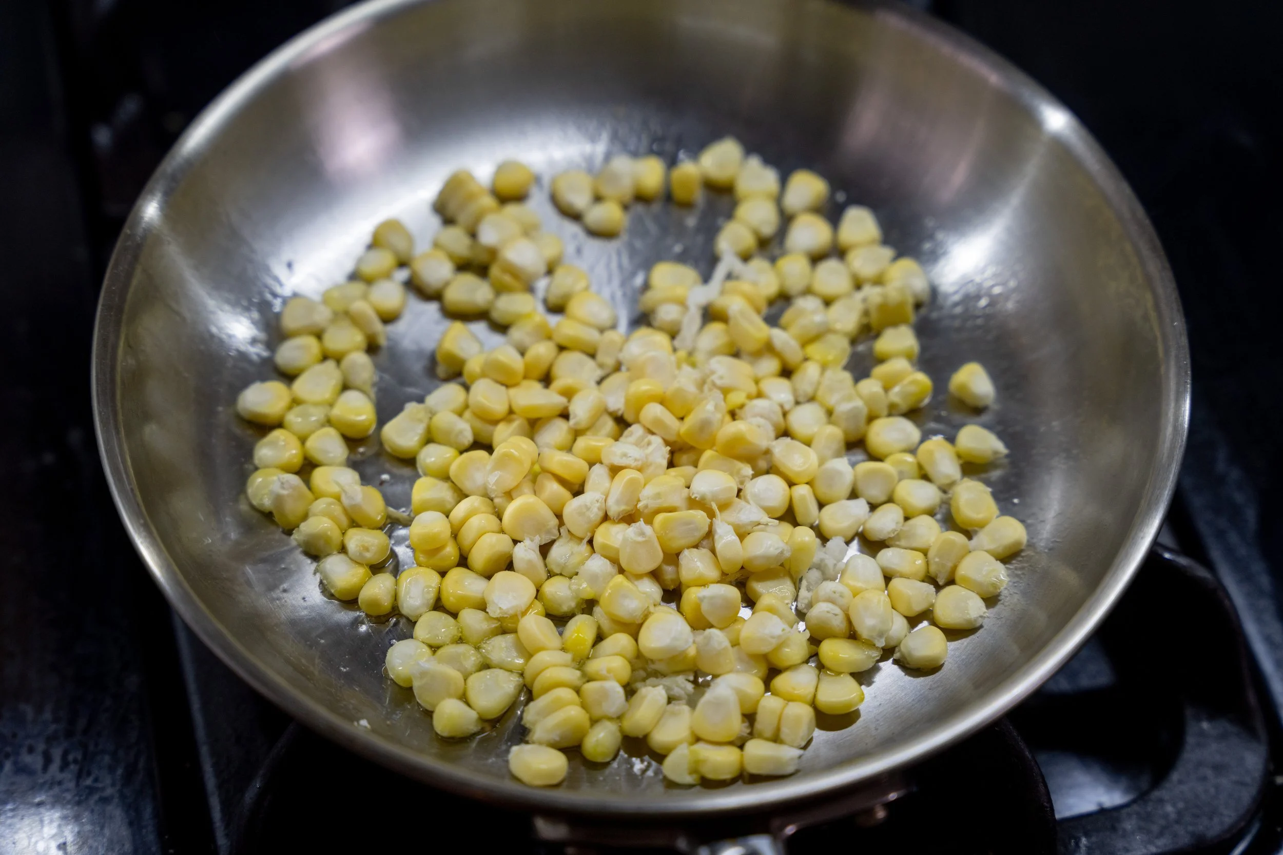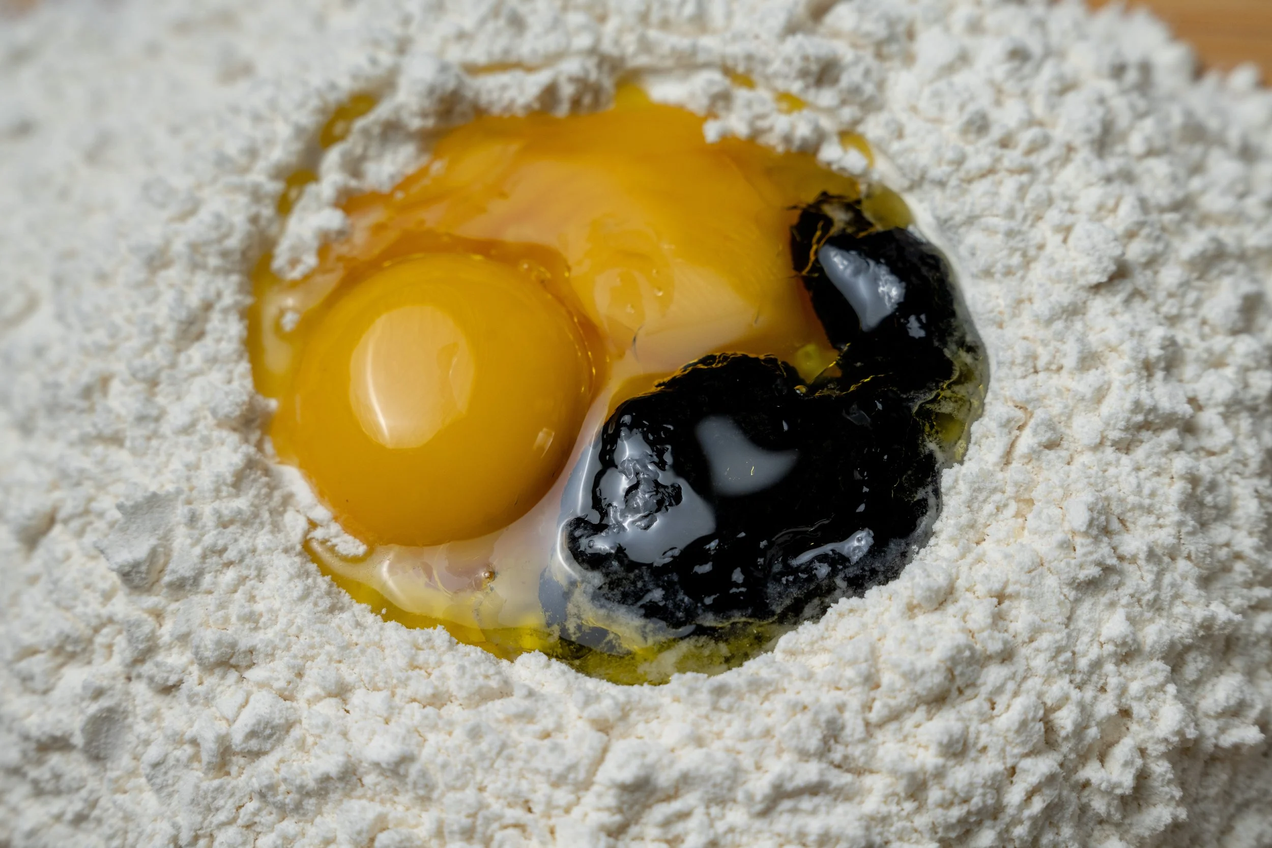 Handmade squid ink cappelletti with corn–potato-padano purée, finished with charred corn and a touch of chili.