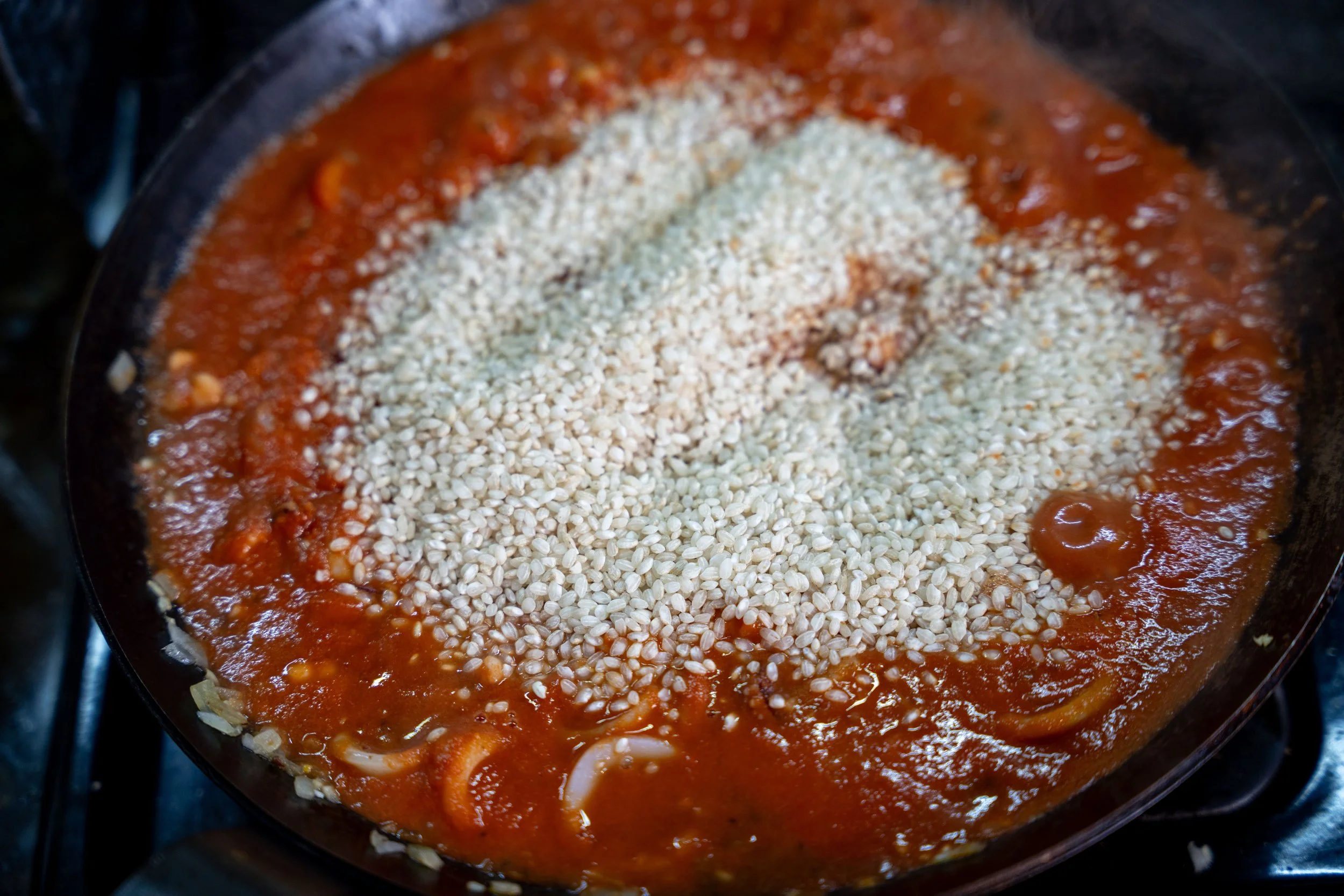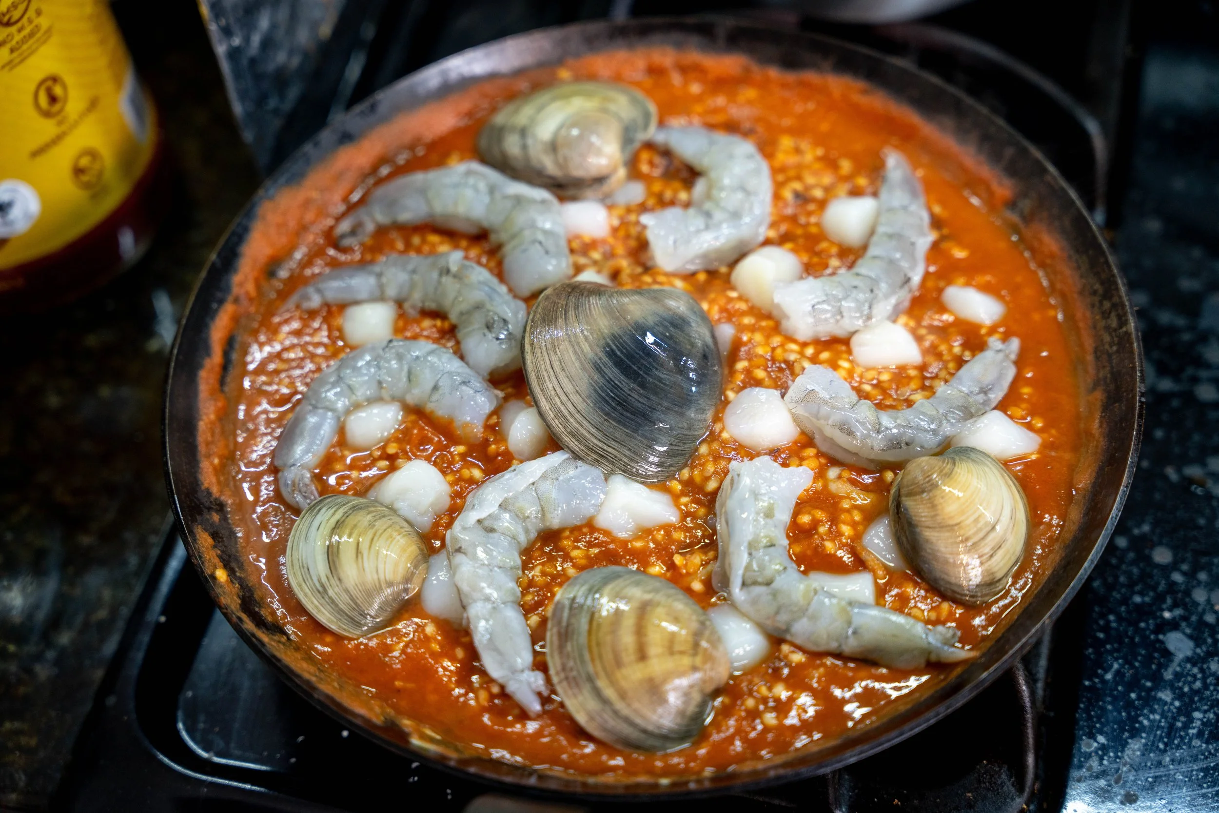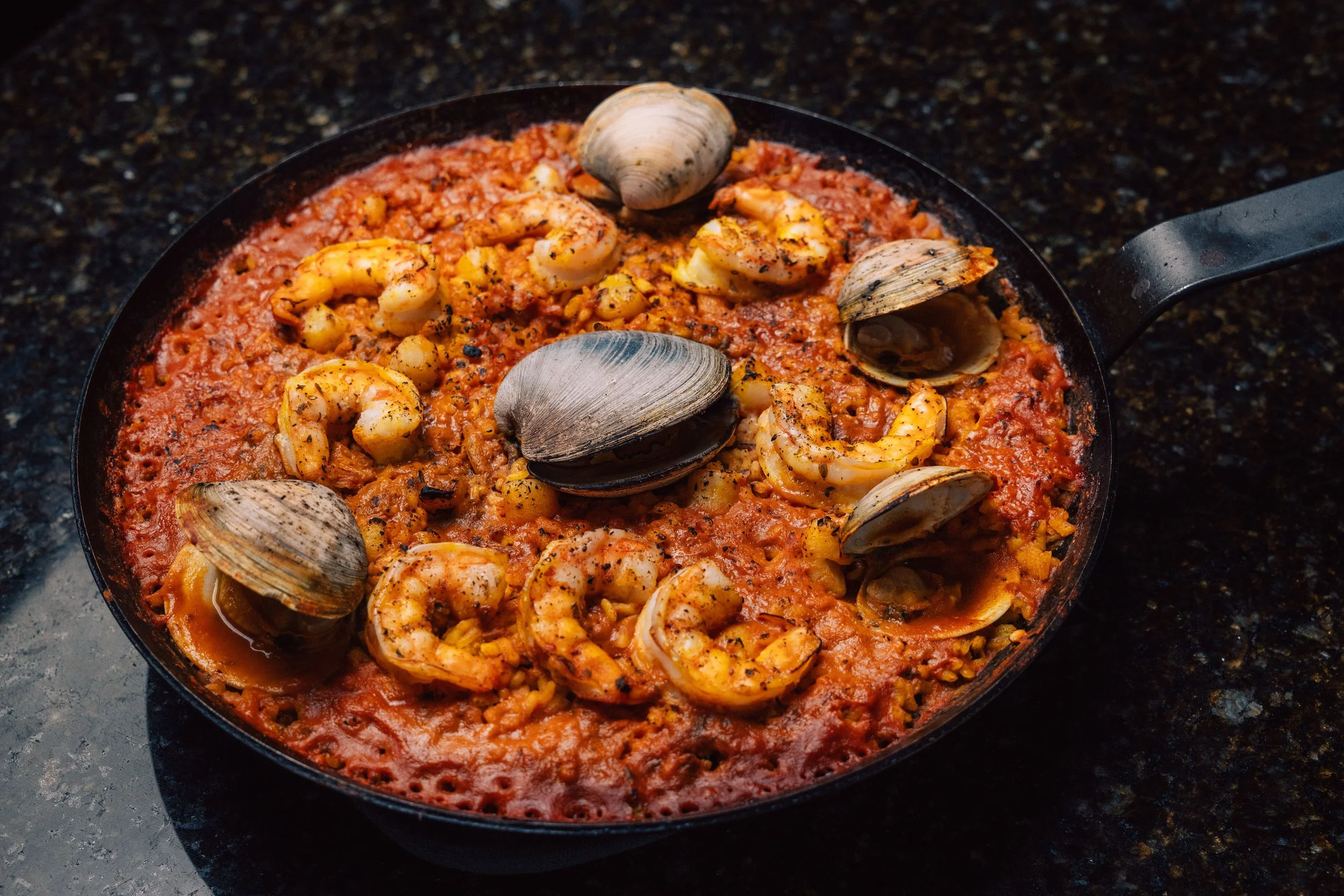 Week 21: Seafood Paella Feb 7 Written By Cheng Xing Bomba rice cooked in a tomato–seafood base, mixed with shrimp, clams, calamari, and scallops. Cheng Xing