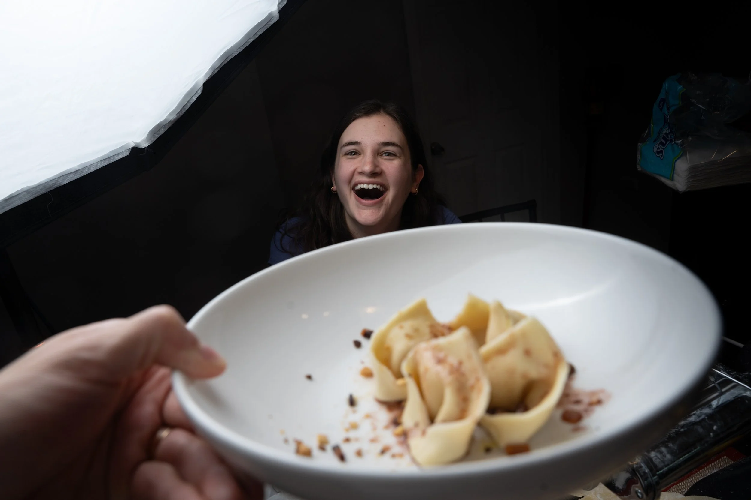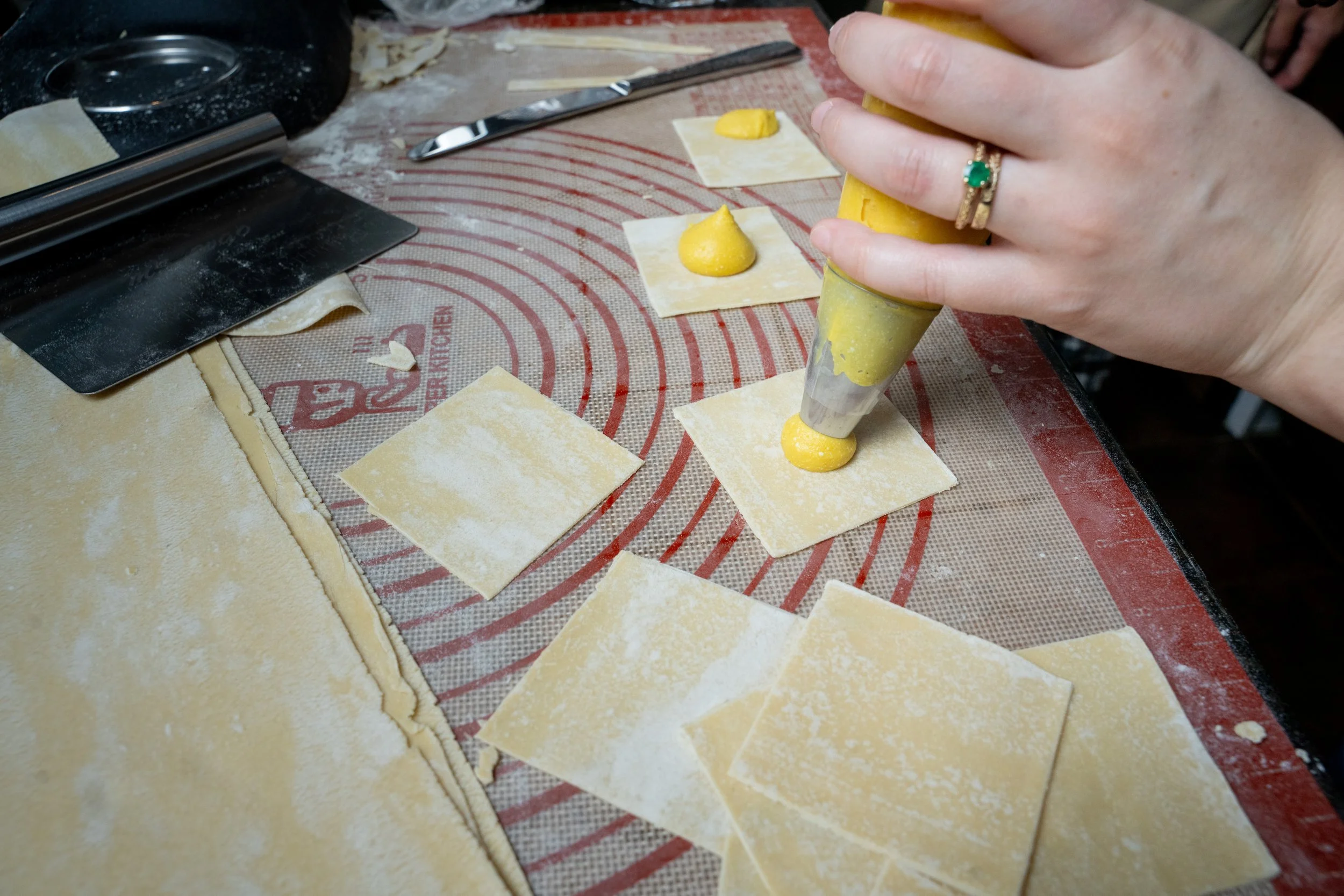 squeeze puree in the middle of the square pasta sheet, fold into tortellini. Special thanks to Mr. Aguila and Mrs. Aziz!