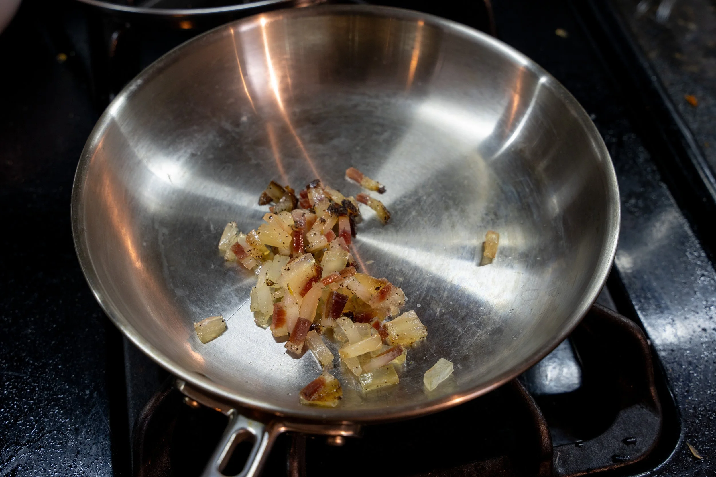 fry some guanciale, take out the pieces after a few min, add red wine and reduce, chili oil. Add cold butter to emulsify butter into sauce.