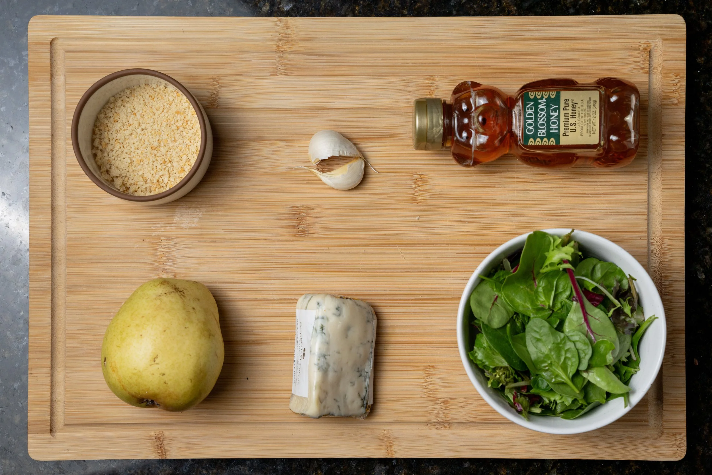 Ingredients: Breadcrumb, garlic, honey, pear, gorgonzola, green leaves